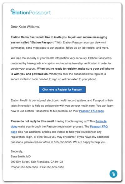 Contact the EdHealth and Wellness care team to set up your account. They will send you an invitation to activate your account. Patients are required to provide an active email account where the invitation will be sent, and patients must provide a cell phone number where an activation code will be sent. If you are unable to provide an email or cell phone number, please speak with your care team to discuss an alternative option to set up your Elation Passport account.